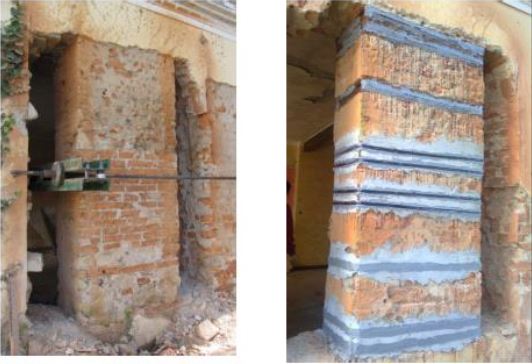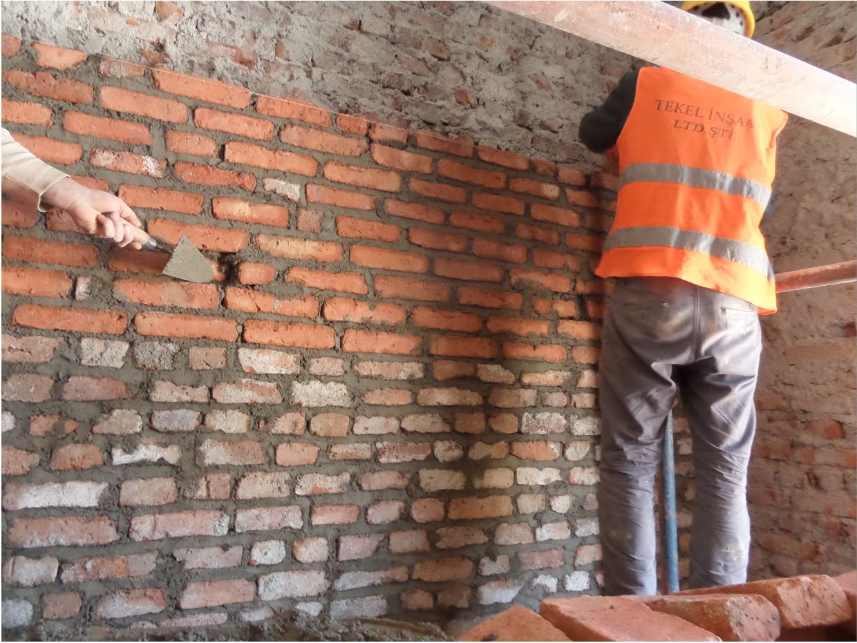 Yığma yapılarda taşıyıcı elemanlar yapının duvarlarıdır. Herhangi bir nedenle duvarlarda çatlaklar meydana gelmişse bunların sıva boya badana ile değil, tekniğine uygun olarak onarılması gerekmektedir. Onun için resimlerde ve şekilde görüldüğü gibi, çatlaklar kalınlıklarına bağlı olarak temizlenir, çimento enjeksiyonu, tamir harcı ve dikiş demirleri ile duvar parçalarının bütünlükleri sağlanır. Muhtemel çatlakların yüzeye yansımamaları için file ile kapatıldıktan sonra tekrar tamir harcı ile kapatılır. Dayanımını kaybetmiş duvar elemanları yenileri ile değiştirilir.
